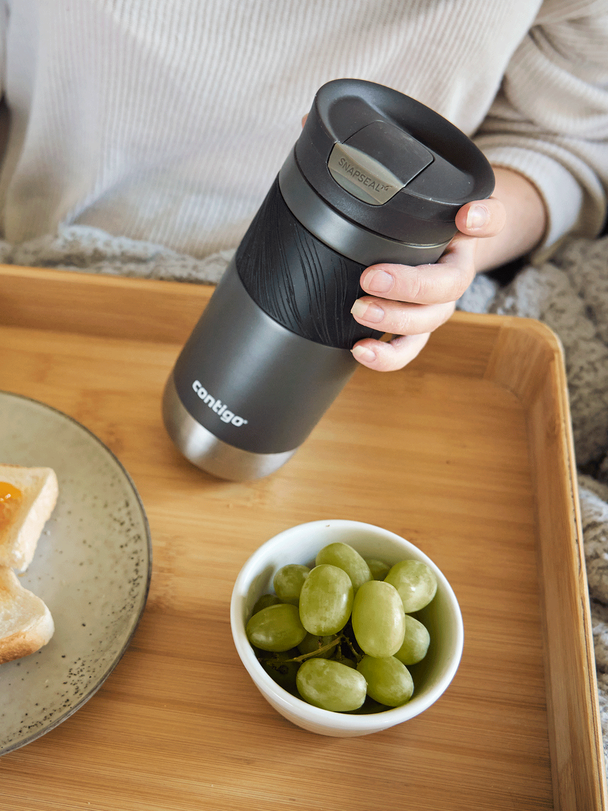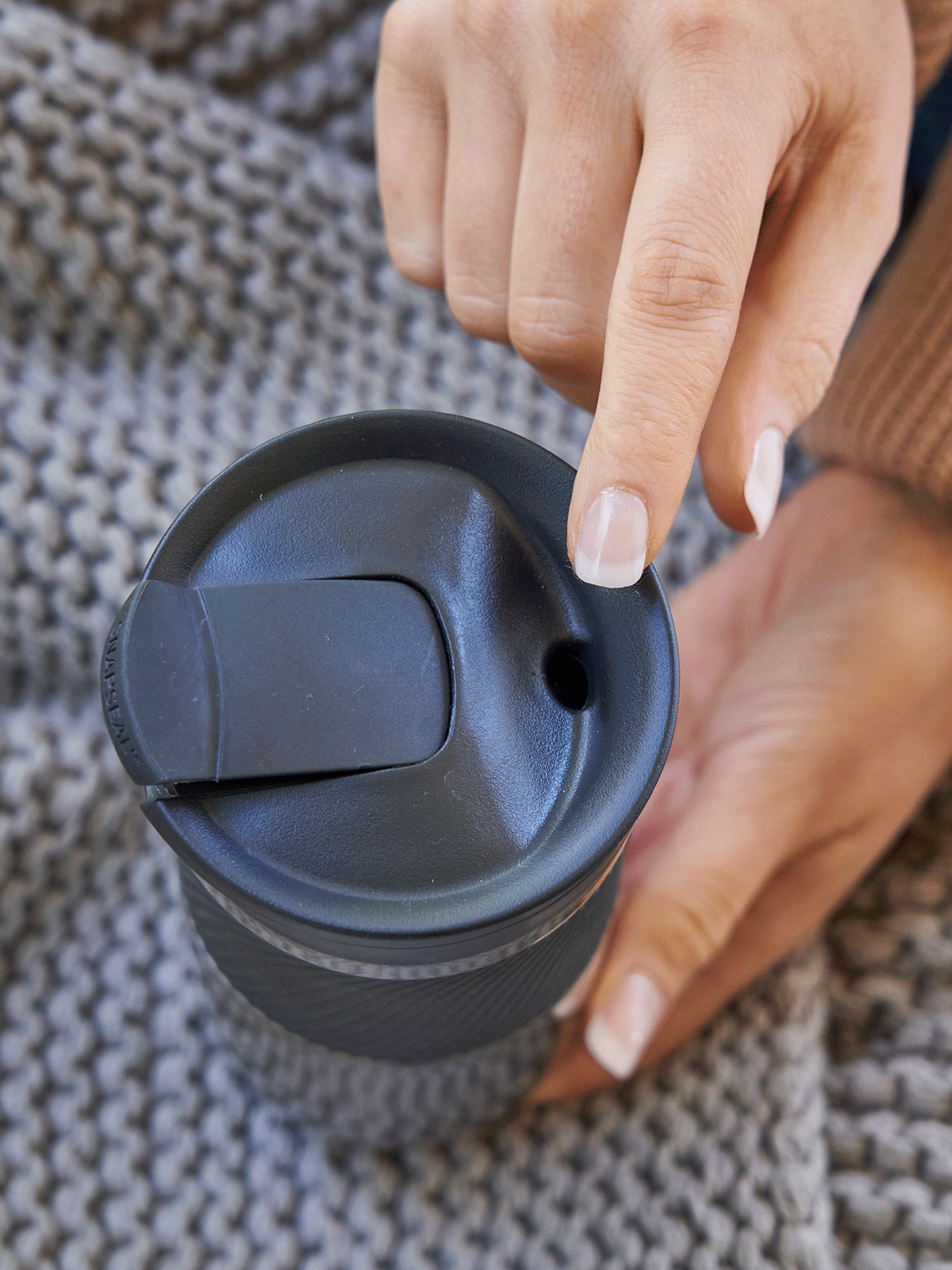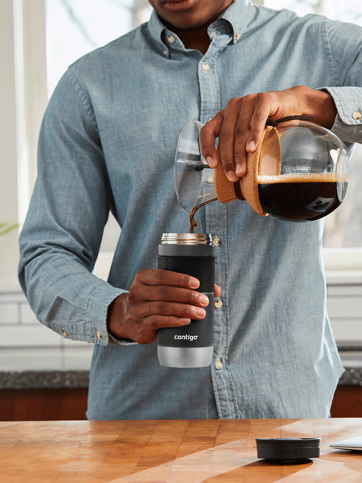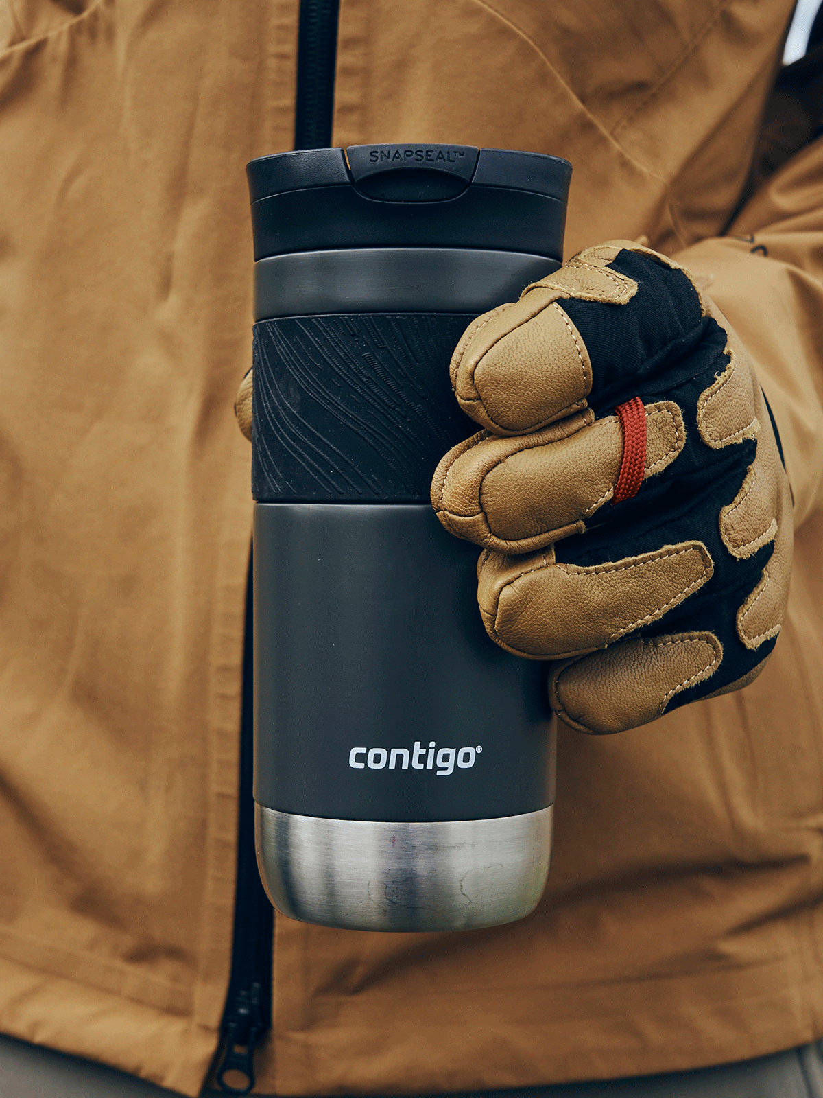 Jako pierwszą w serii Byron 2.0 Contigo na warsztat wzięliśmy silikonową osłonę znajdującą się na górnej części kubka. Umieściliśmy na niej nieregularne, wypukłe linie o różnej wielkości. Dzięki nim nawet wtedy, gdy Twoje dłonie są wilgotne,kubek termiczny Contigo Byron nie wyślizgnie Ci się z rąk.