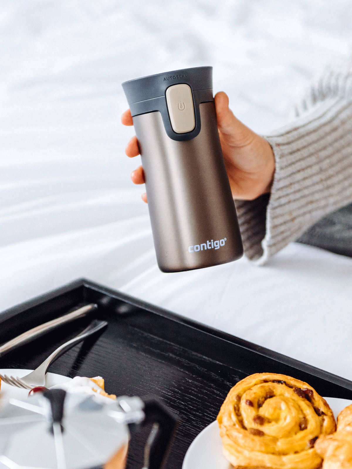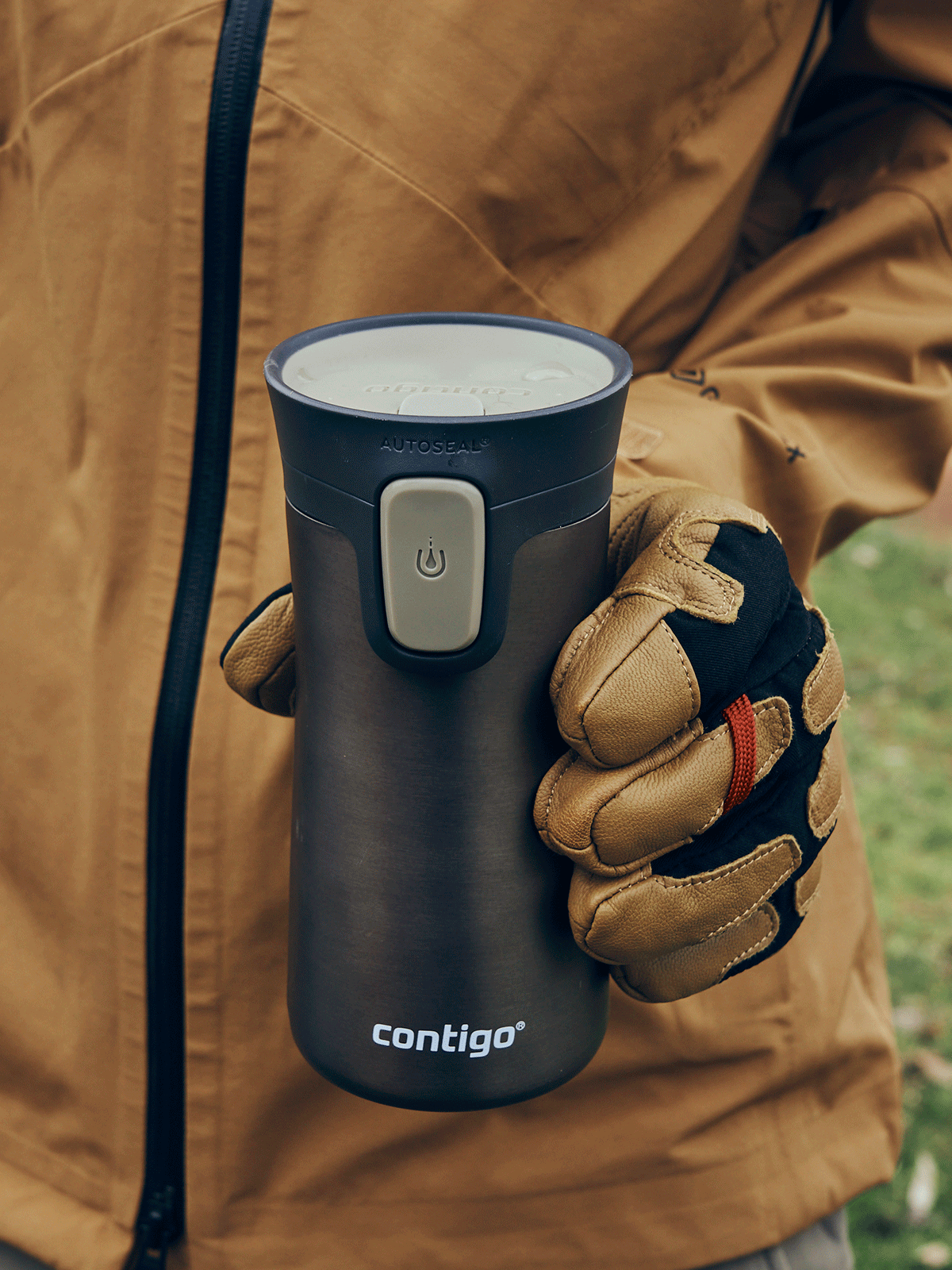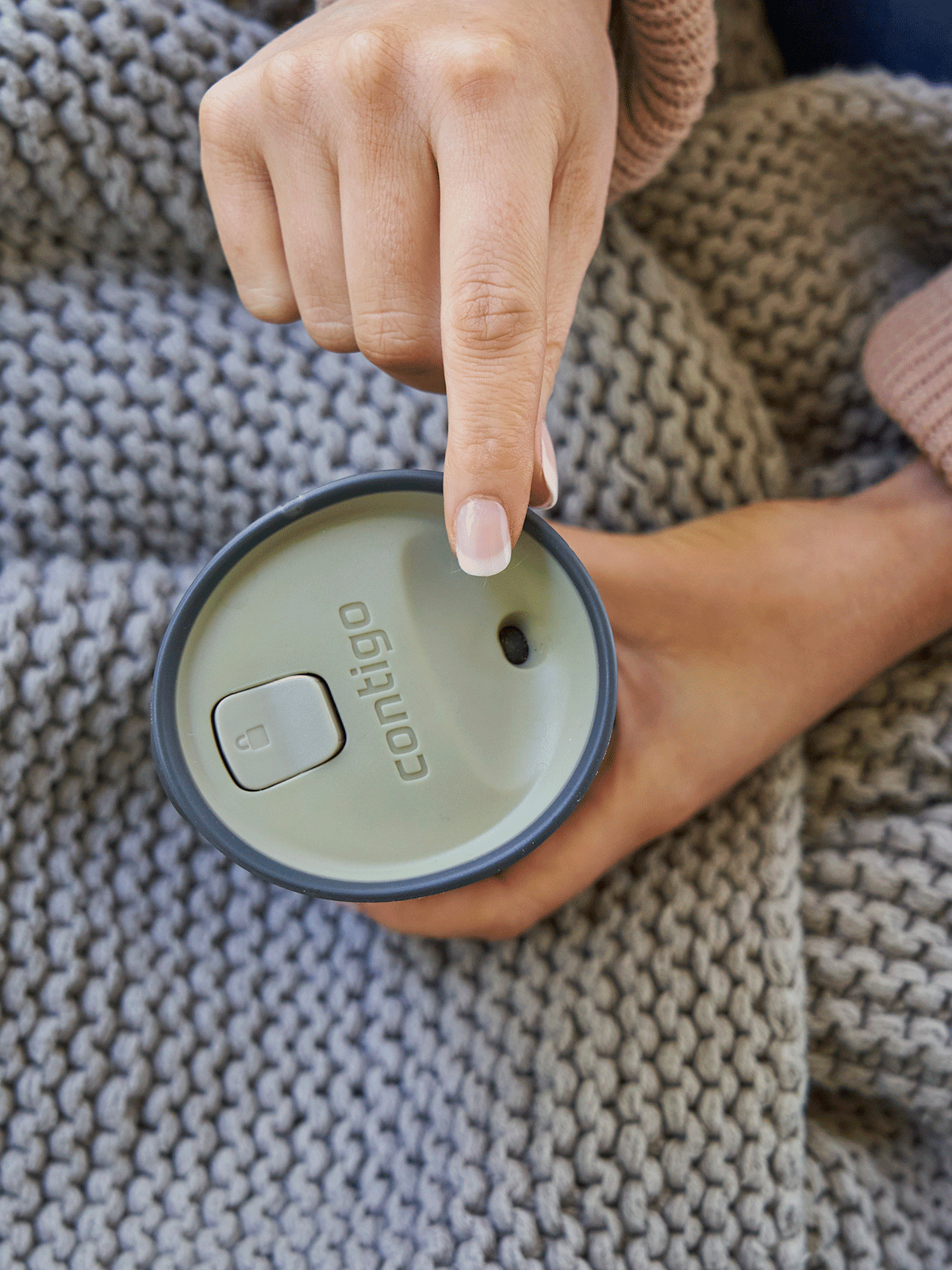 Chcesz napić się kawy, którą wlałeś do kubka Contigo Pinnacle? Naciśnij i przytrzymaj przytrzymaj przycisk AutoSeal wbudowany w boczną ściankę nakrętki, który zwolni blokadę ustnika. Zwolnij przycisk a blokada ponownie się uruchomi chroniąc napój przed rozlaniem. Dodatkowy przycisk blokady umieszczony w górnej części nakrętki zabezpieczy system przed ryzykiem przypadkowego otwarcia w Twojej torebce lub plecaku. Cały system blokowania spokojnie obsłużysz 1 ręką nawet podczas jazdy autem.