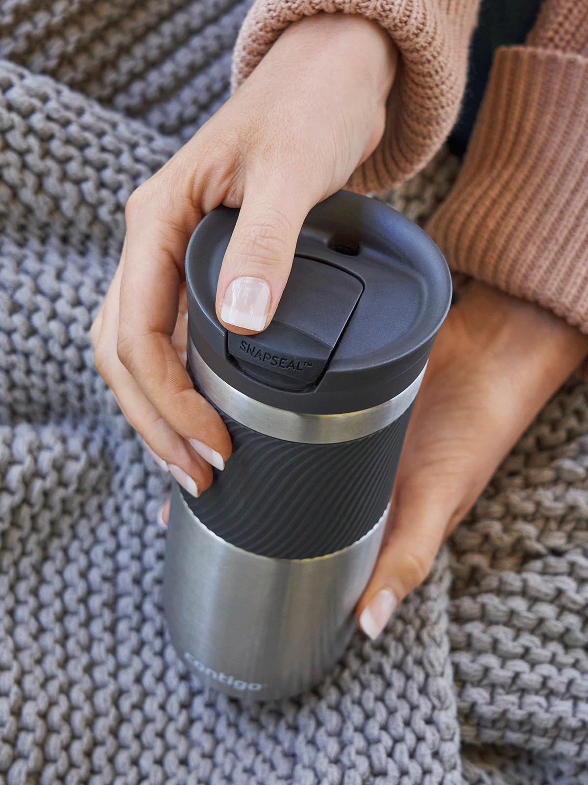 Chwytasz kubek w pośpiechu. Albo chcesz się wygodnie napić kawy gdy na dłoniach masz rękawiczki. W żadnej z tych sytuacji kubek termiczny Contigo Byron nie wyślizgnie Ci się z rąk. Na jego korpusie znajduje się bowiem duża, antypoślizgowa osłona, która znacznie ułatwia pewne trzymanie kubka.